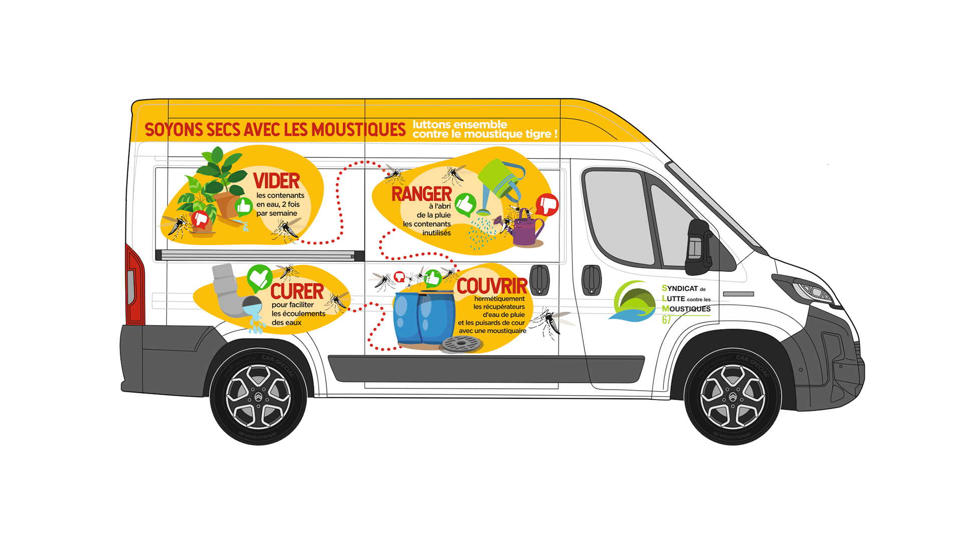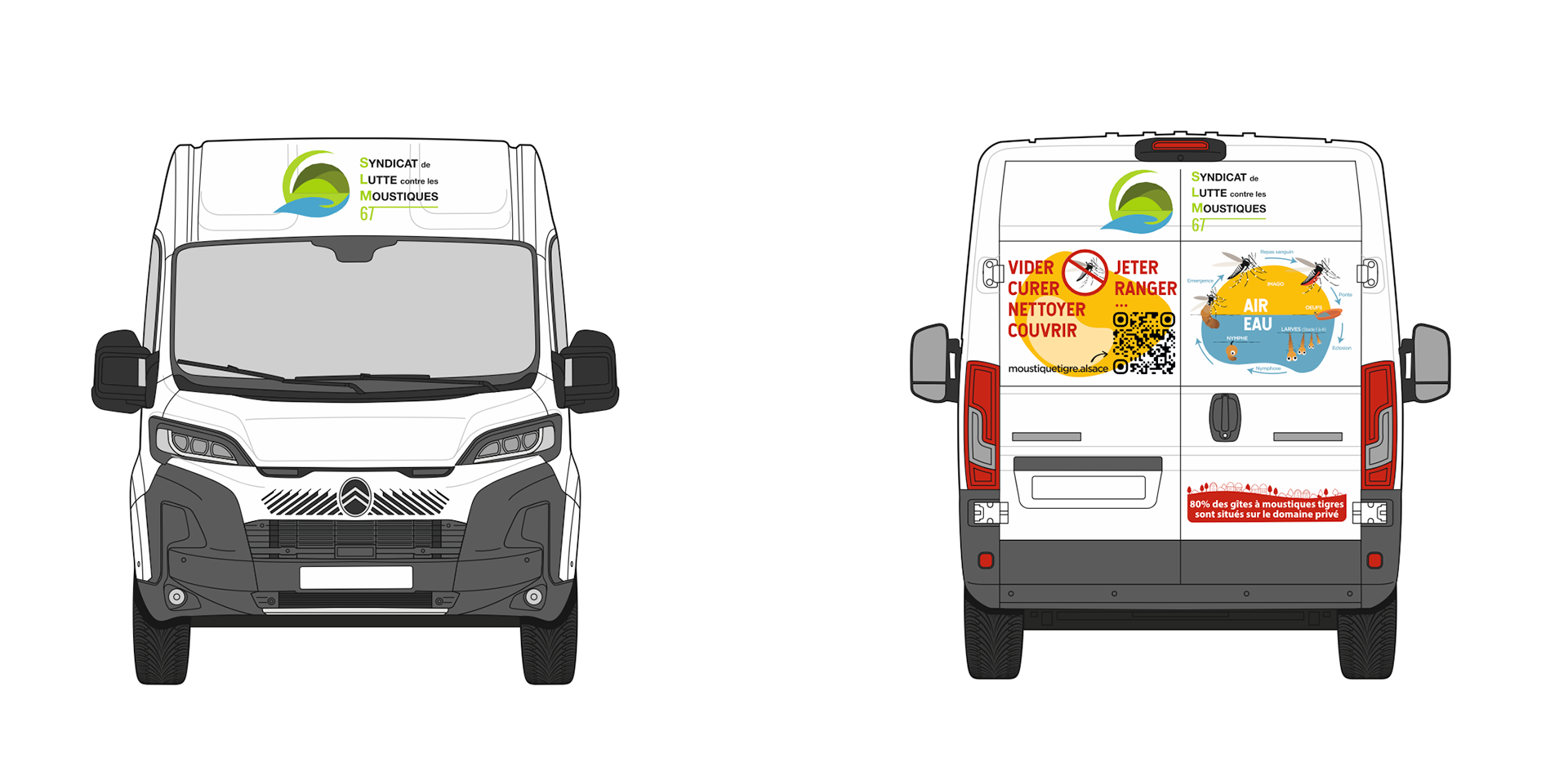 Design global & communication visuelle · Conception d’une identité visuelle complète pour une campagne de prévention contre le moustique tigre en Alsace. Le projet comprend le design du flocage d’un véhicule de sensibilisation ainsi que la réalisation de deux supports numériques : un site d’information et une application de signalement. L’objectif était de traduire des messages de santé publique en visuels pédagogiques, accessibles et immédiatement compréhensibles par le grand public, tout en assurant une cohérence graphique entre les supports physiques et digitaux.